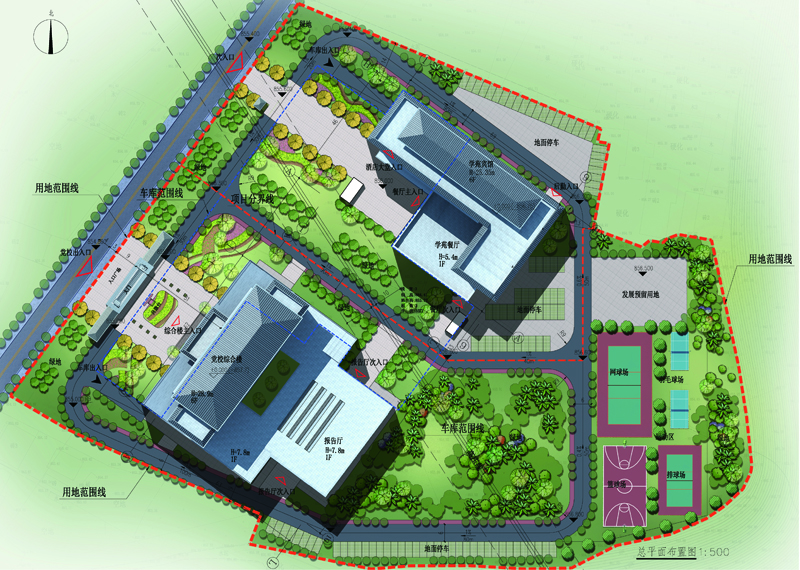 党校新校区项目选址于桃花源街道东流口村4组(小地名:五家湾),距离现党校有11.8公里,项目用地面积为48.5亩。总建筑面积:25613.00m2(其中综合楼建筑面积:11871.00m2,学苑宾馆建筑面积:13742.00m2),设计综合楼1栋、学苑宾馆1栋、地下车库、大门,能满足培训、办公、会议、就餐和住宿等功能。