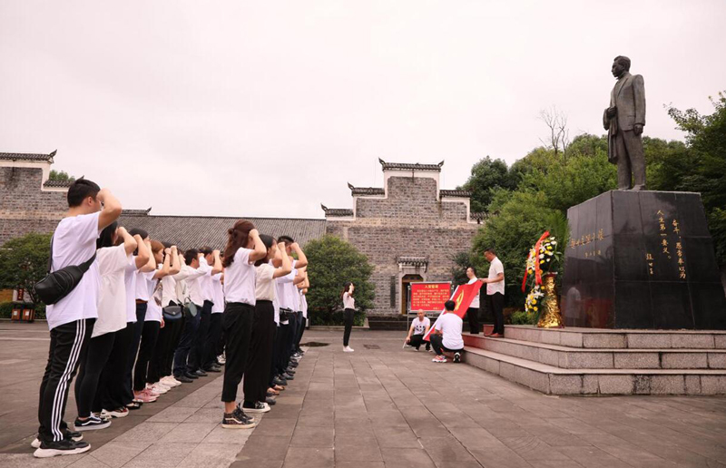 参观完苗圃基地又乘车前往龙潭赵世炎故居,在主持人的带领下,大家在车上齐声高唱《没有共产党就没有新中国》、《党啊亲爱的妈妈》《红星歌》等振奋人心的爱国歌曲,激发起了全体党员干部无限的爱党爱国热情。来到赵世炎同志纪念馆,全体党员向赵世炎同志敬献花篮,站在先烈的雕像面前党员们面对着党旗铿锵有力的重温入党誓词:“我自愿加入中国共产党,拥护党的纲领,遵守党的章程,履行……。”随后,大家怀着十分崇敬的心情参观赵世炎同志故居,认真聆听讲解员详细介绍赵世炎烈士革命的一生。