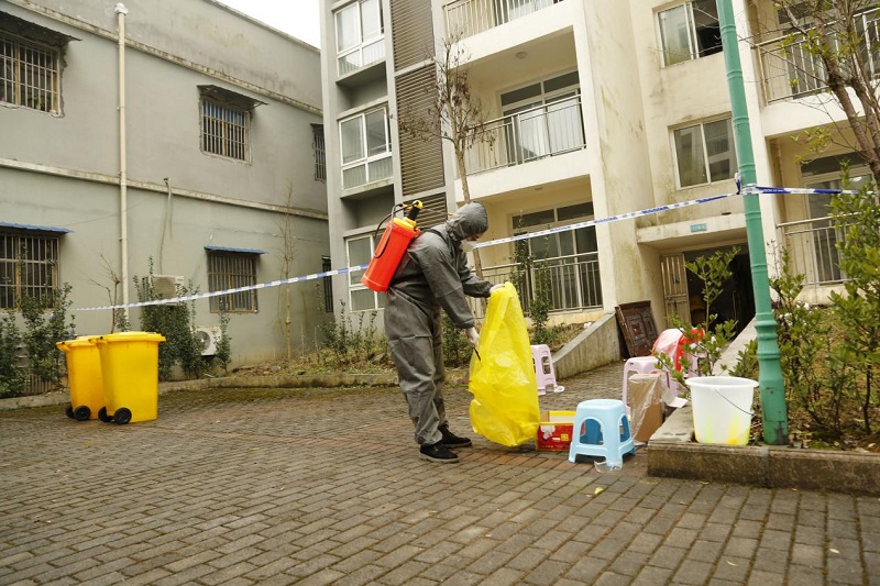 (sunbet申搏集团职工消毒清理垃圾中 汪登平摄)